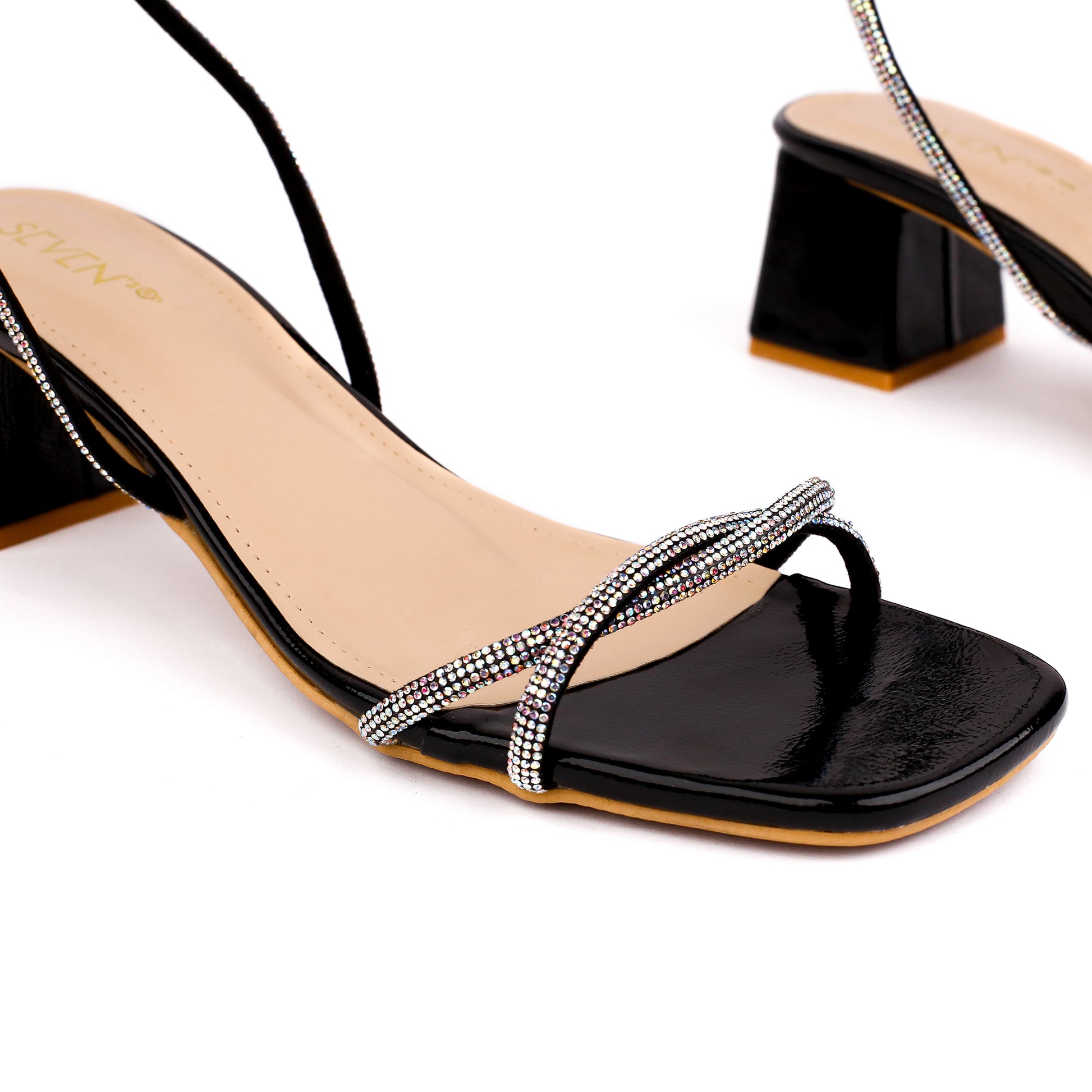 Meet our Black Straps Heels, designed for versatility and elegance. These heels feature a distinctive strappy design with a secure ankle closure, perfect for any setting. Accentuated with subtle crystal embellishments for a touch of sparkle, they are ideal for enhancing both day and evening looks. Step into comfort and style with these chic heels, suitable for every occasion.