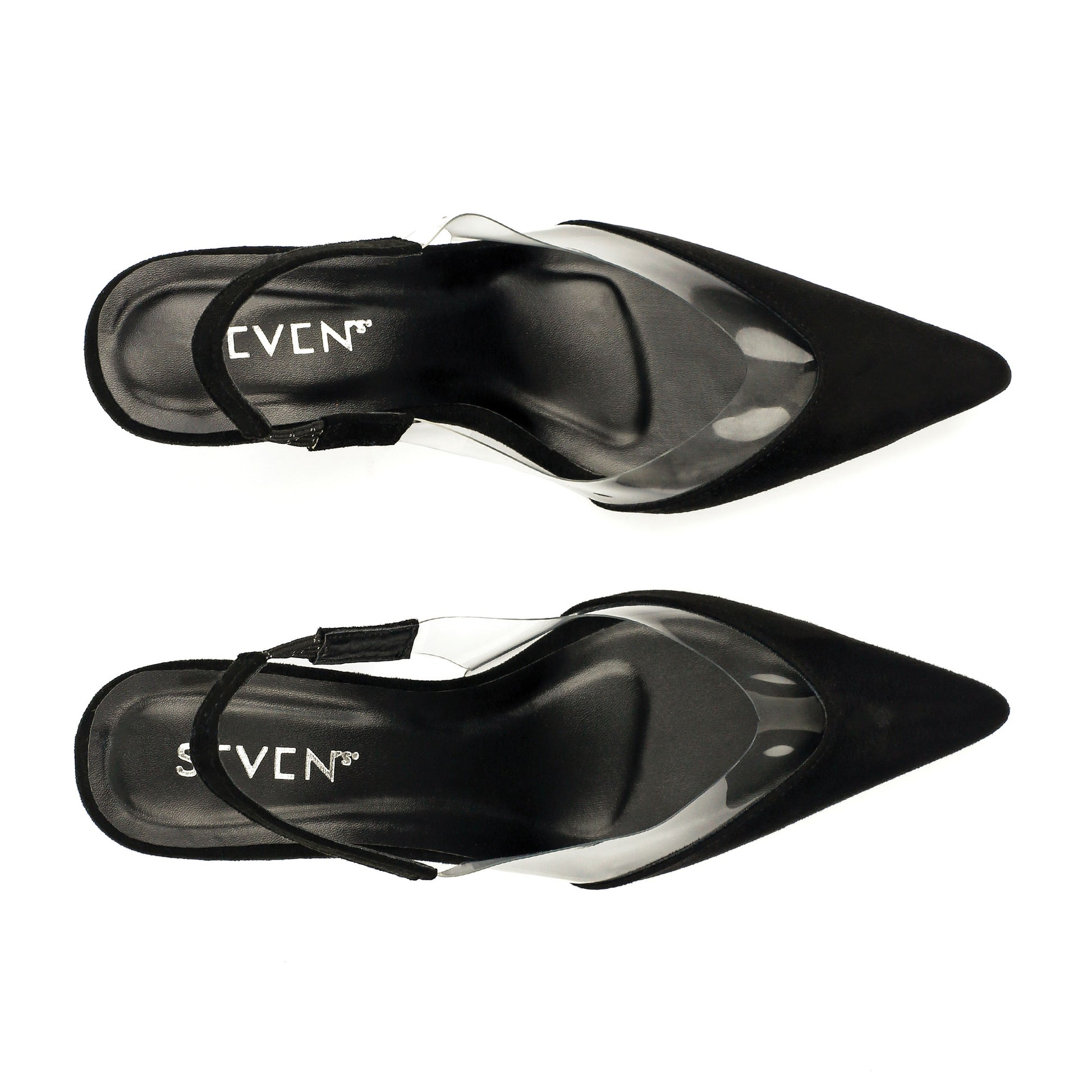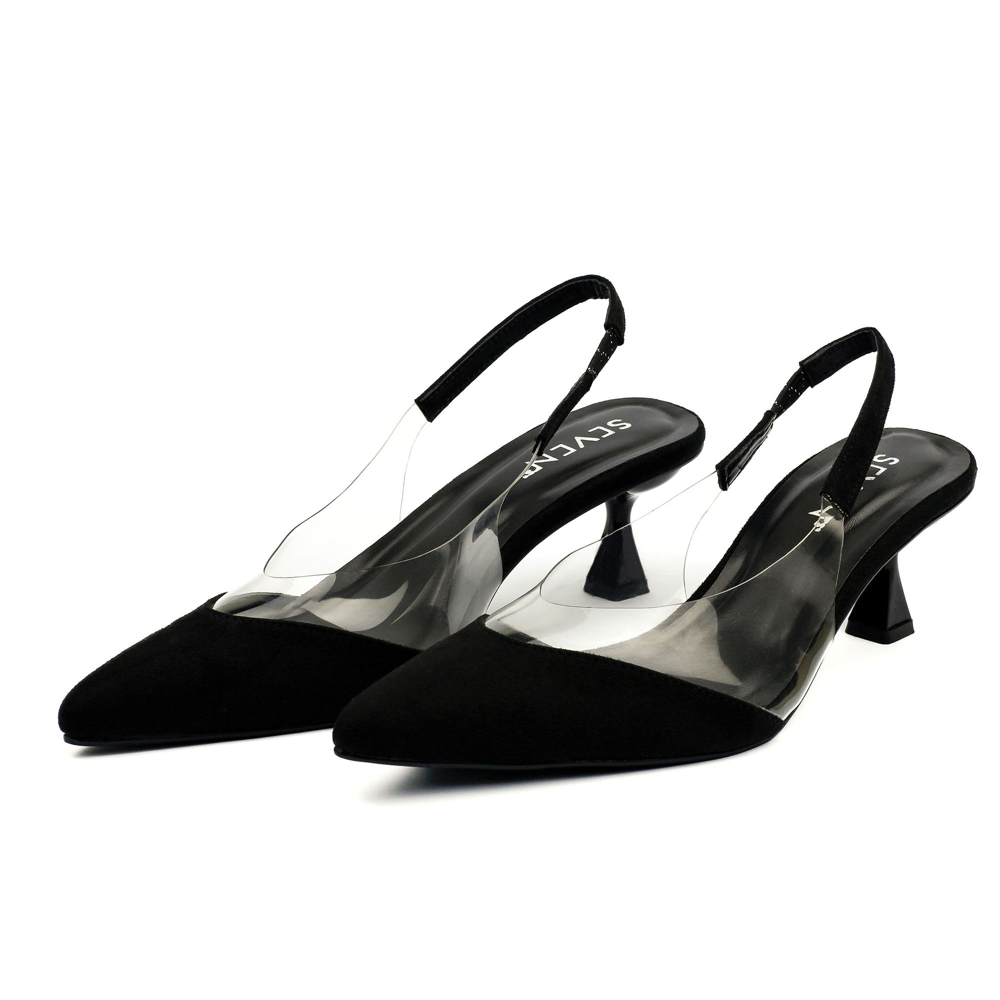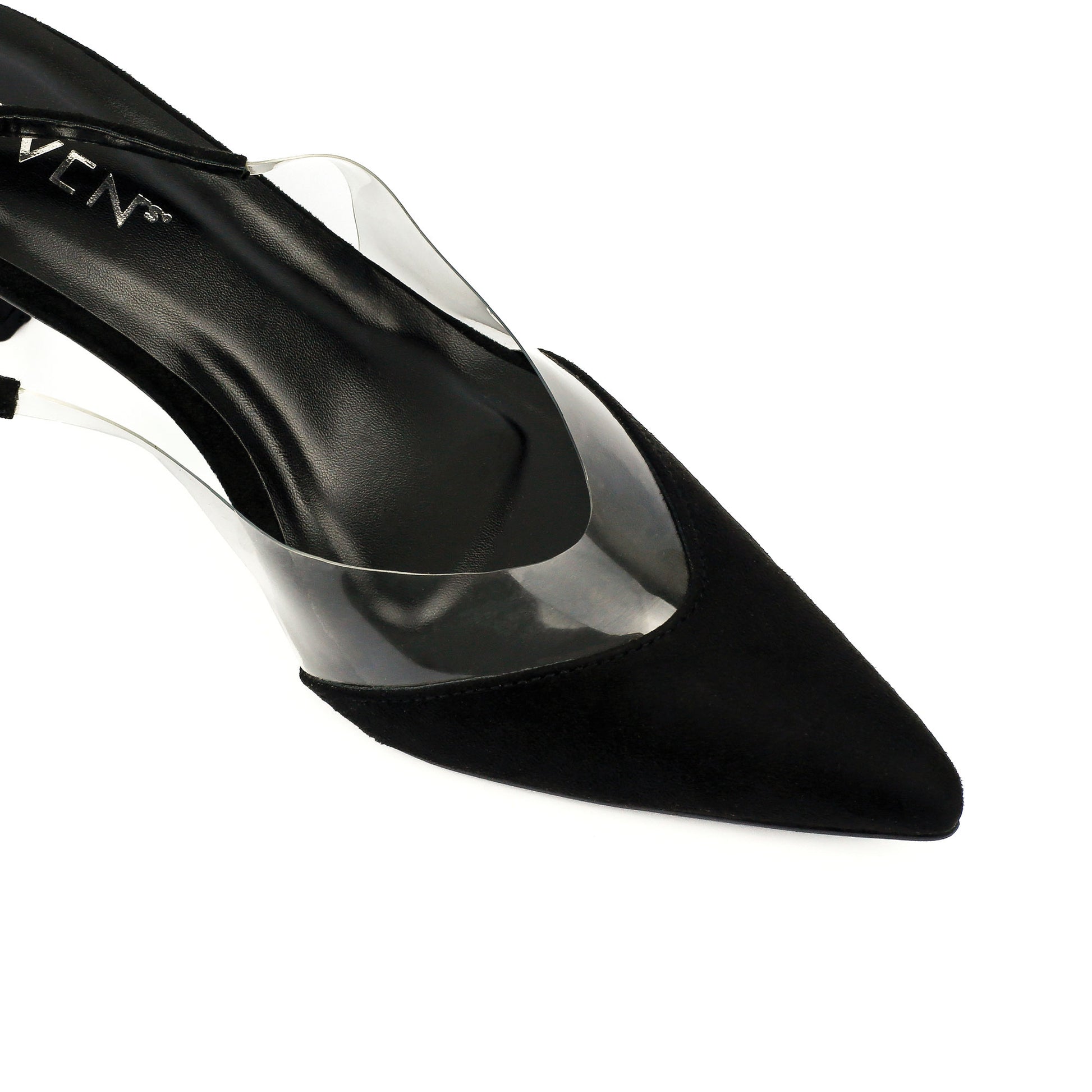 Embrace timeless elegance with these Black Slingback Heels from SEVEN's. The classic black suede finish paired with transparent side panels creates a striking balance between modern chic and vintage appeal. Perfect for adding a touch of sophistication to both formal and casual ensembles, these heels elevate any outfit with ease.